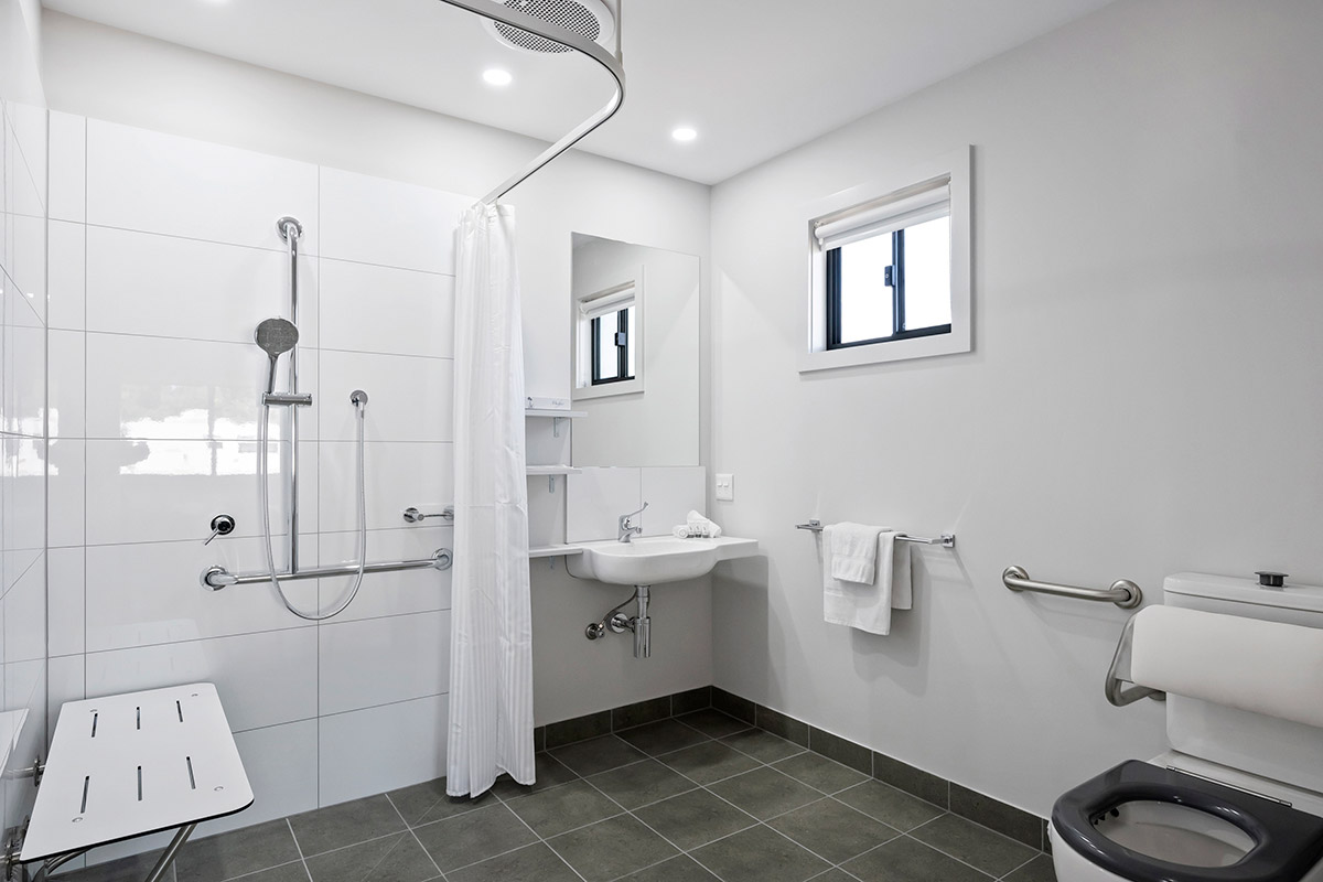 The studio features seamless entry via a concrete driveway and ramp, along with a spacious walk-in shower, seating, and grab rails to provide additional comfort and support.