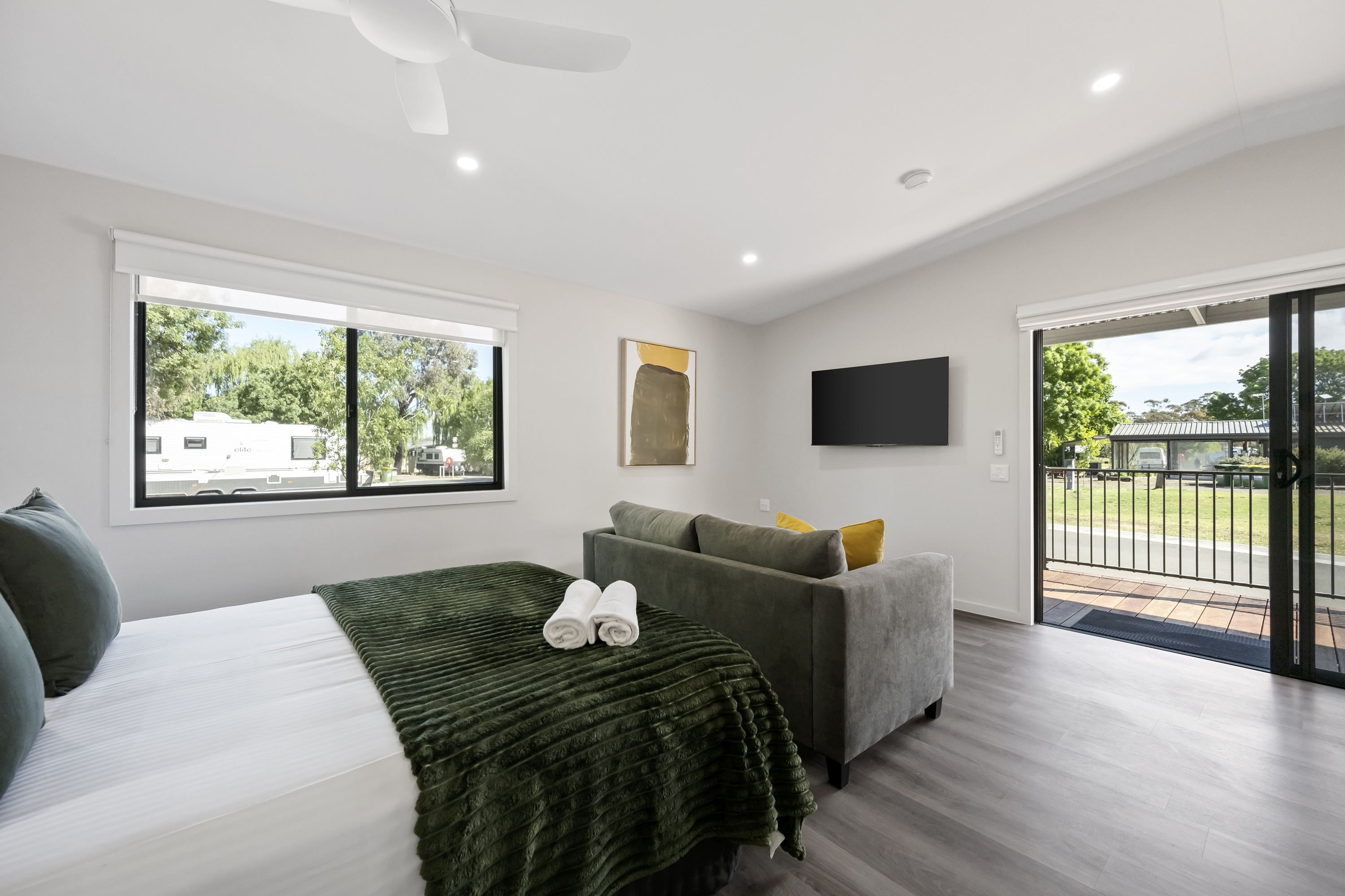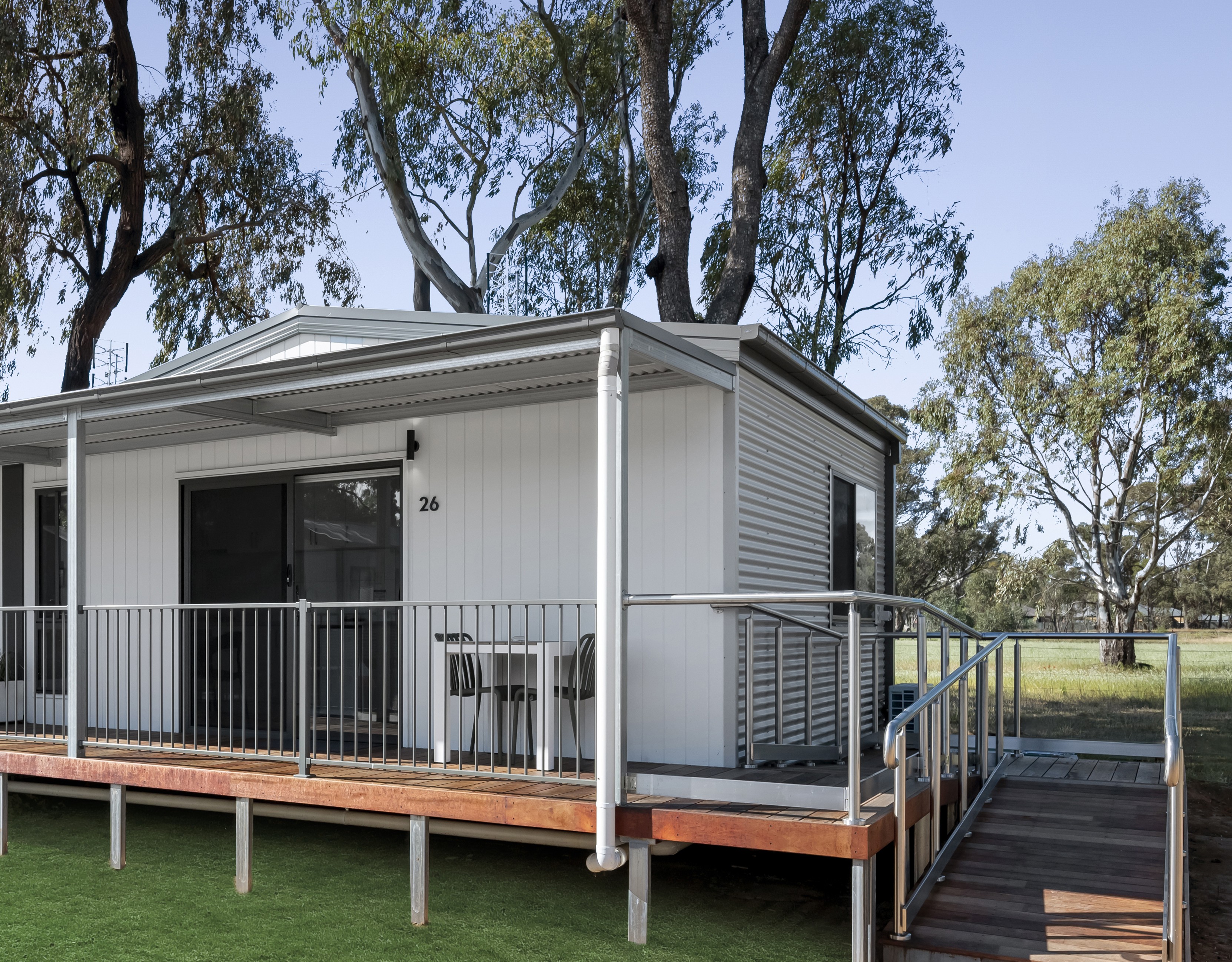 This brand-new 2 bedroom cabin has been thoughtfully designed for comfort and accessibility. It comprises of two side by side independant cabins that can be connect via an adjoinging door. Please note, that only one of these cabins has the AS1428 design features.
