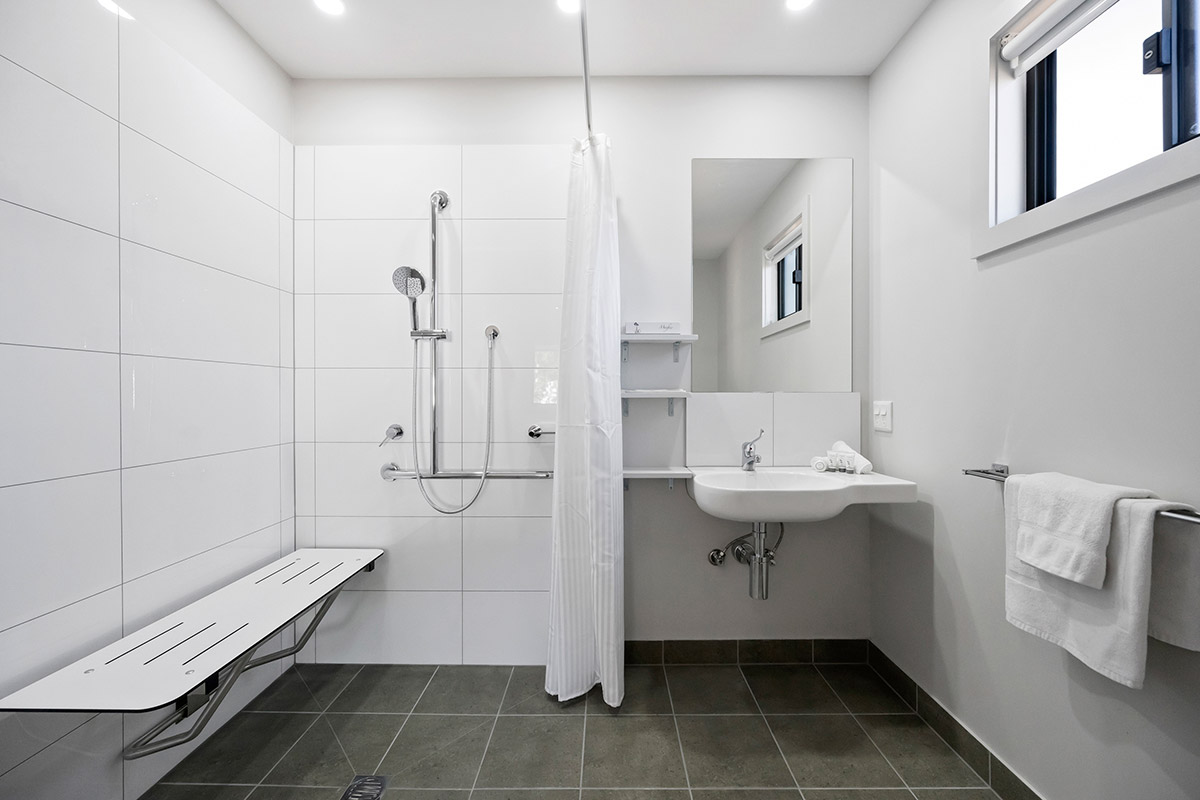 The two studios can be joined or separated by an adjoining door. The accessible studio features seamless entry via a concrete driveway and ramp, along with a spacious walk-in shower, seating, and grab rails to provide additional comfort and support. The second studio is similar in layout but does not include the accessible features of the main cabin, allowing family or friends to stay together while still enjoying their own private space.